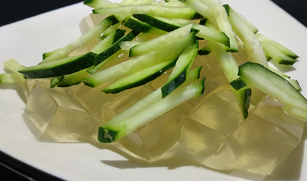海涼粉1.8kg(10g特斯特海涼粉專用粉溶于1.8kg飲用水中制備得到)、黃瓜絲 0.5kg、大蒜泥 0.2kg、食用鹽 0.02kg、其它調(diào)味料(白砂糖、味精、芝麻醬、香油、麻辣紅油、香菜)根據(jù)個(gè)人口味適量添加。