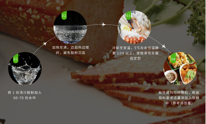 (1)湯汁膠粉兌水比例不宜過高,否則凝膠弱,易出水;